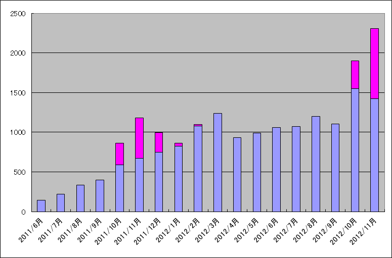 外来診療については、外来患者数が徐々に増加しております。2012年11月には月間のべ2308人(1日平均96.2人)にご利用いただいております。開院以来の診察券ID発行数は4214人となりました。